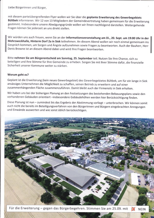 Ja - wenn Sie gegen den vorliegenden Bebauungsplan Nr. 8, 5. Änderung und die Erweiterung des Gewerbegebiets Bültbek und die Pläne von Herrn Browne sind.
