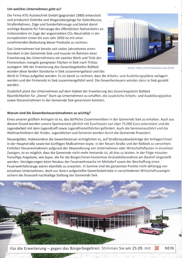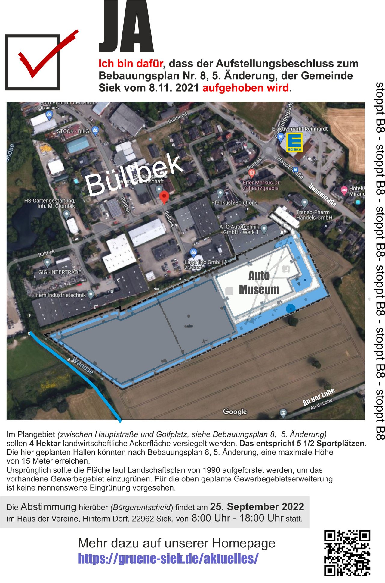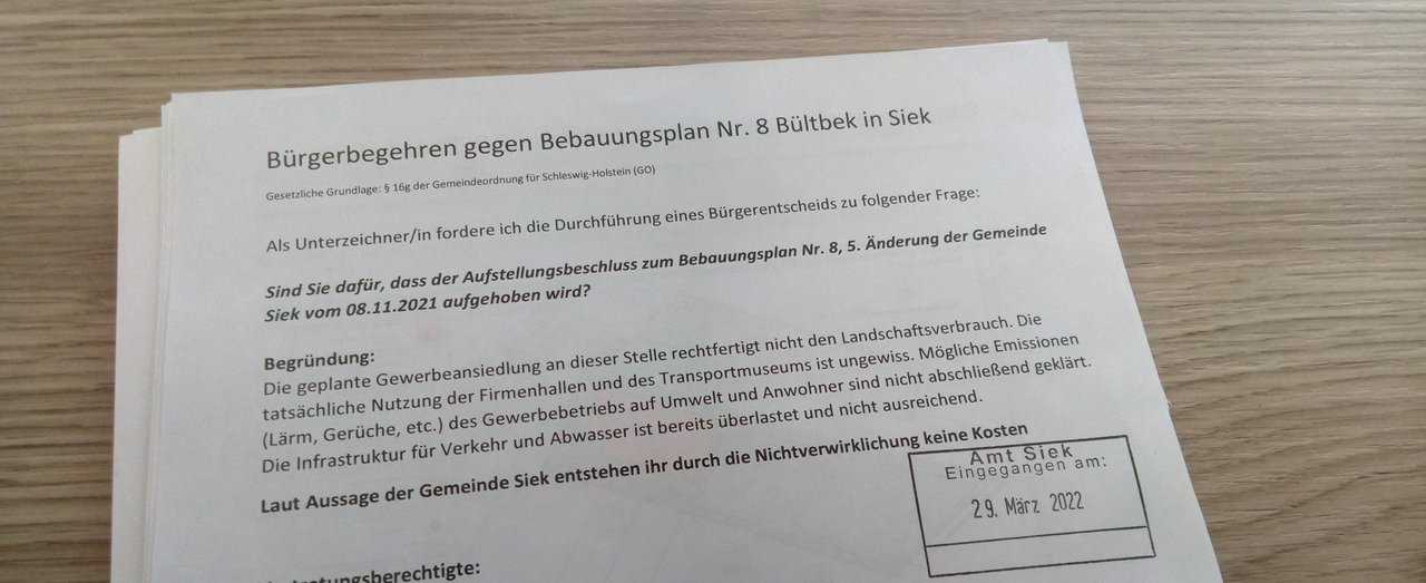 Am 25. September 2022 findet in Siek der Bürgerentscheid für die Aufhebung des Bebauungsplans Nr. 8 , 5. Änderung gegen die Erweiterung des Gewerbegebiets Bültbek, Siek“ statt. Hier findet man Informationen zum Bürgerbegehren auf der Internetseite des Amt Siek.