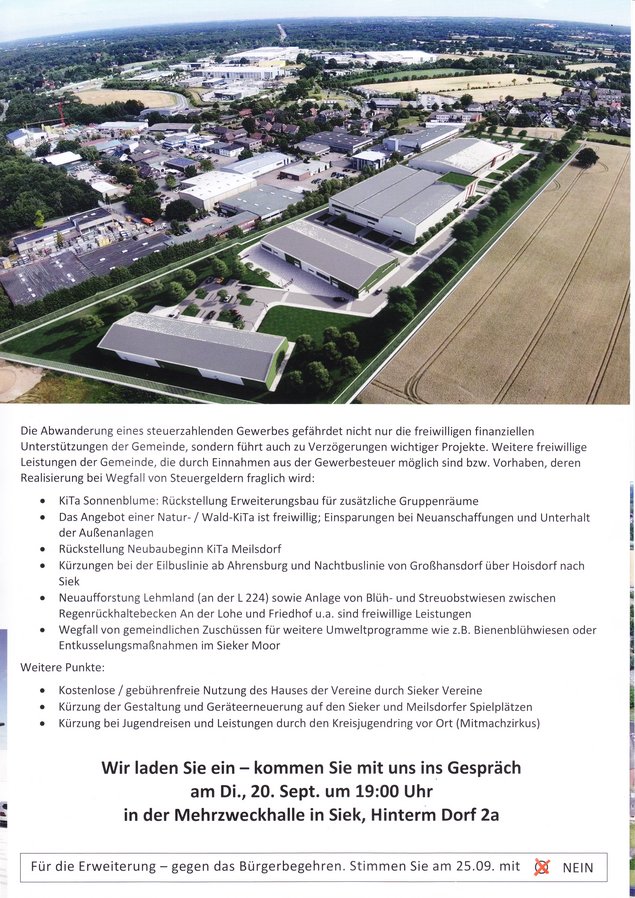 Am Sonntag, den 25. September entscheiden daher die Bürgerinnen und Bürger der Gemeinde Siek / Meilsdorf, ob die ungezügelte Versiegelung von wertvoller landwirtschaftlicher Ackerfläche für eine regionale Lebensmittelversorgung in der Gemeinde Siek / Meilsdorf gebremst werden kann oder nicht.